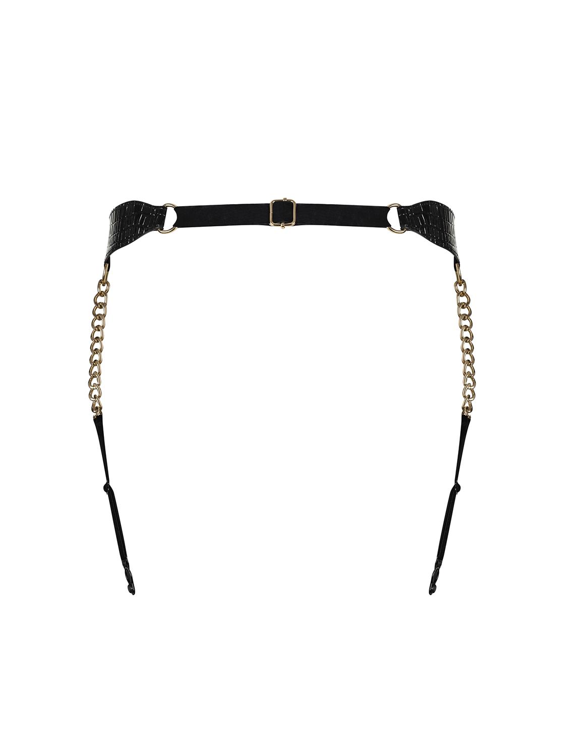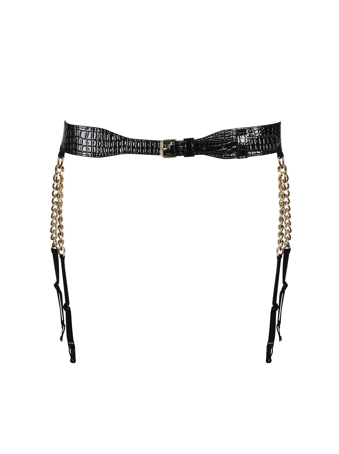 Exotische A767 garter belt van gebosseleerd imitatieleer in zwart met verstelmogelijkheden in de taille en de bretels en een gespsluiting op de buik. Met schakels in de vorm van goudkleurige ringen en kettingen. Zacht en huidvriendelijk materiaal.