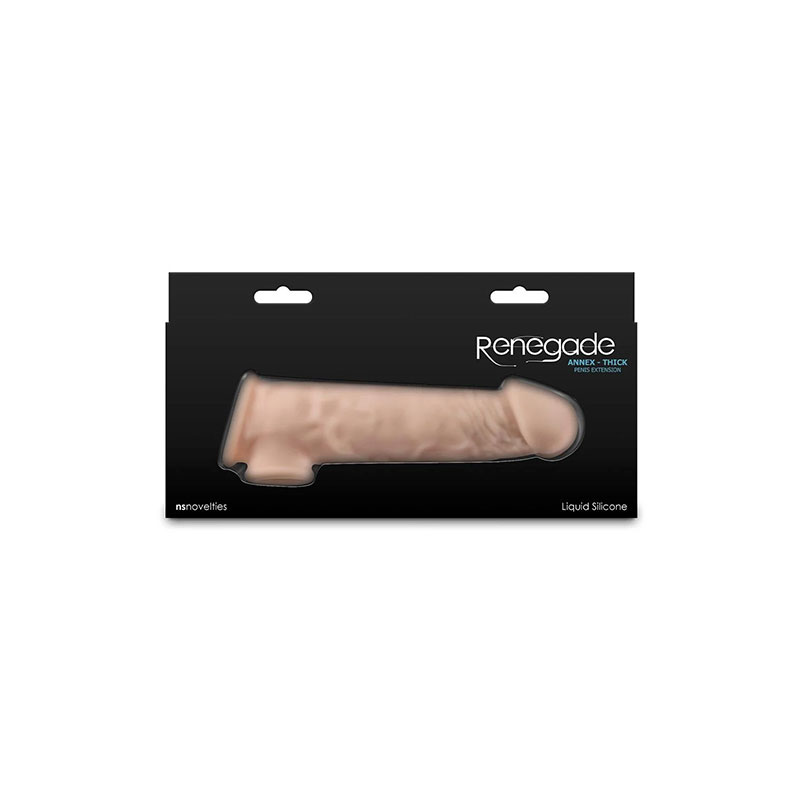 Annex Thick Flesh Penis Sleeve van Renegade. Realistische en superrekbare vloeibare siliconen sleeves met een comfortabele bal-drop-functie die de testikels comfortabel omarmt en stevig op hun plaats houdt. Verkrijgbaar in dikke en dunne versies, Annex sleeves zijn getextureerd voor optimaal genot voor de partner. Geschikt voor alle glijmiddelen.
