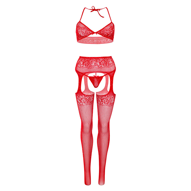 3-delige set bestaande uit een strass-beha-top van zacht kant met strikje, bijpassende string en netkousen met jarretelgordel.