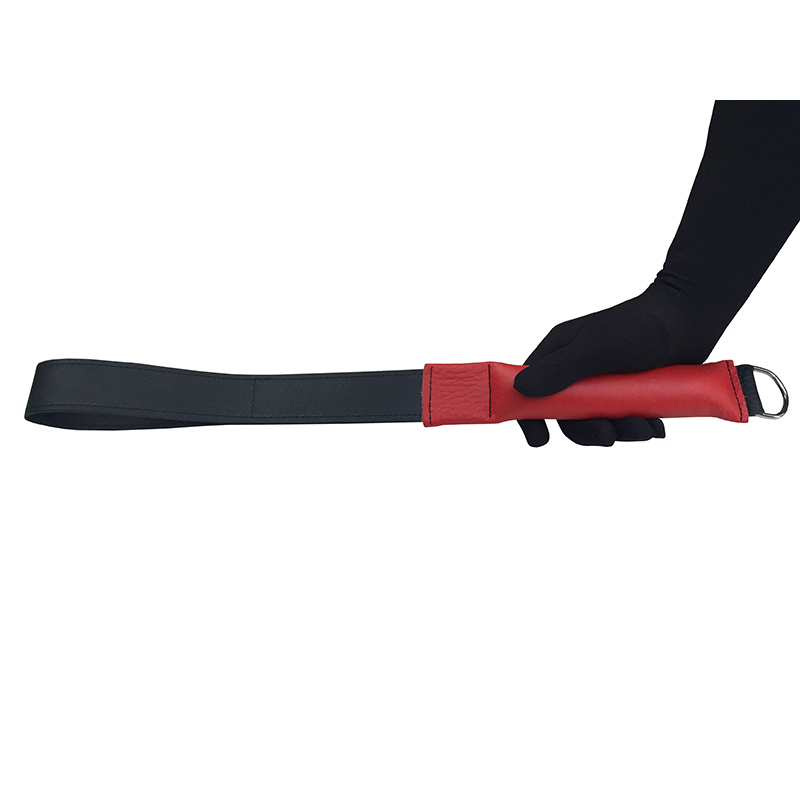 Lederen compacte peddel in de kleuren rood en zwart gemaakt voor zachte of intense straf.