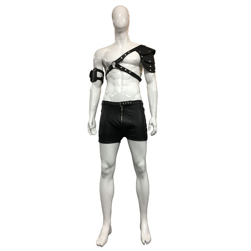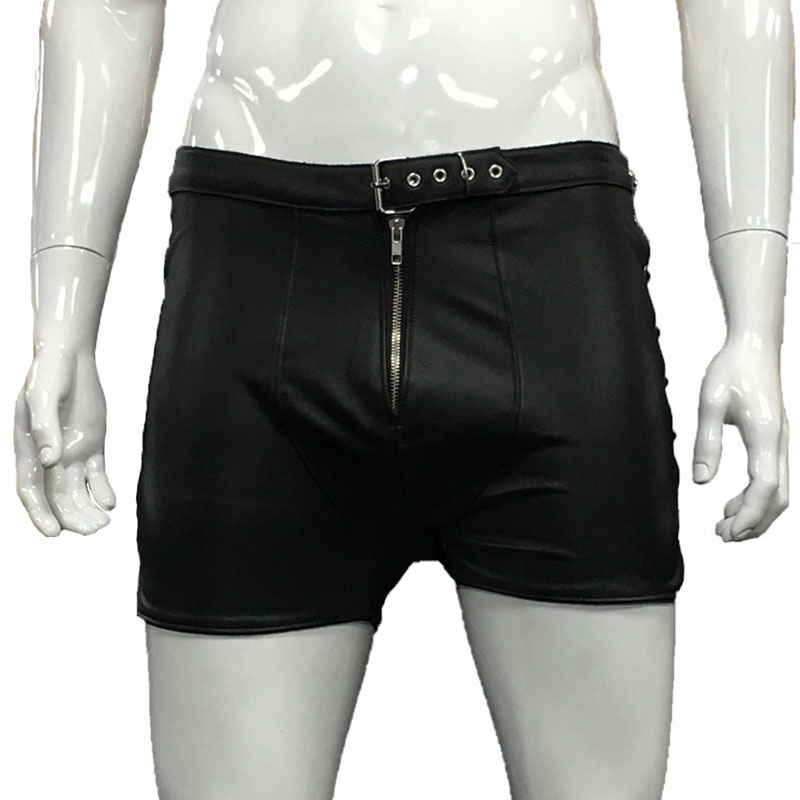 Korte leren broek met drie riempjes en veters aan beide zijkanten. Deze korte broek sluit aan de voorzijde door middel van een rits en riem met gesp die vast zitten aan de broek. In het midden van beide zijkanten is de korte broek verstelbaar door wederom een vast zittend riempje met gesp. En rond de benen is het verstelbaar door middel van een vetersluiting.