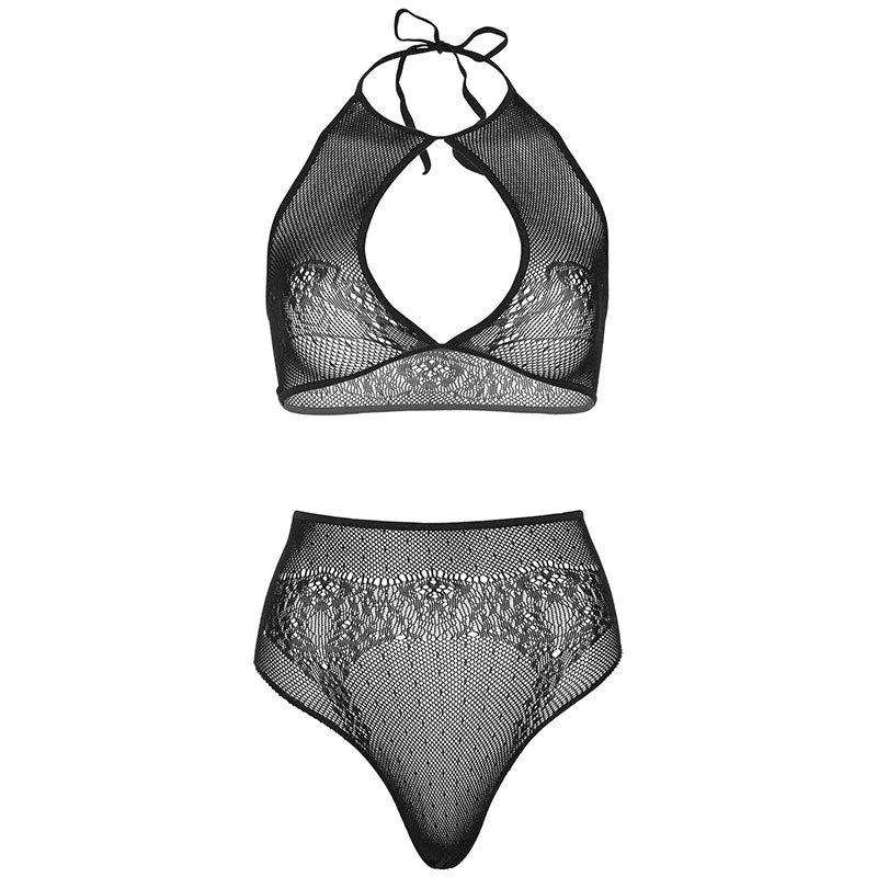 2 delige set bestaat uit een kort haltertopje met kantpatroon en sleutelgat opening en string met hoge taille.