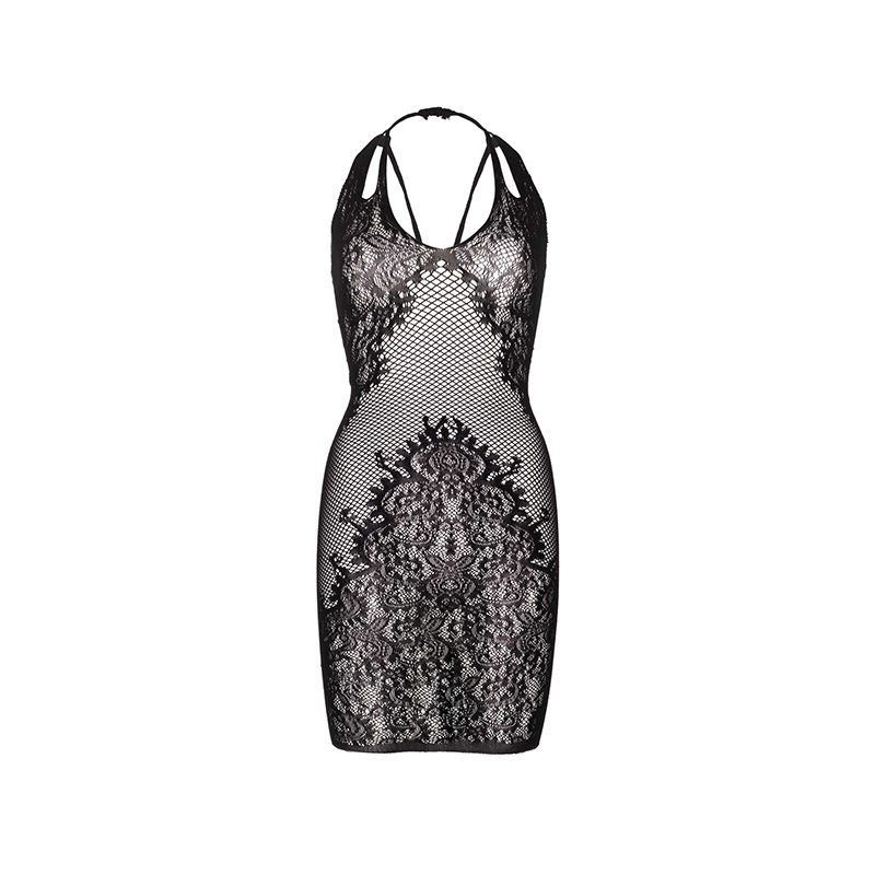 Naadloze net en kanten halterjurk met faux vetersluiting aan de achterkant.