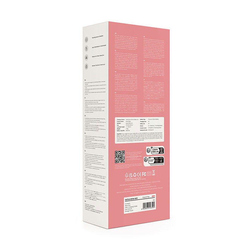 De Mora Neo heeft een geheugenfunctie die hervat op de laatst gebruikte vibratiestand, een reisvergrendeling om per ongeluk inschakelen te voorkomen, een batterij-indicator, USB-oplaadpoort met stofkap en een waterdichte constructie.