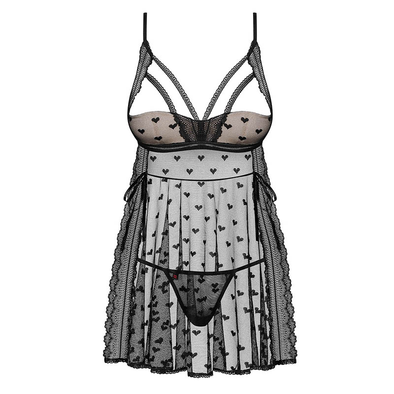 Fenomenale zwart jurkje met een sexy snit en een zachte en elastische materiaalcombinatie van uniek kant en transparant mesh materiaal met romantische hartjes. Met veters aan de zijkant, verstelbare bandjes en halve cups voor een perfecte pasvorm. Bijpassend koord inbegrepen.