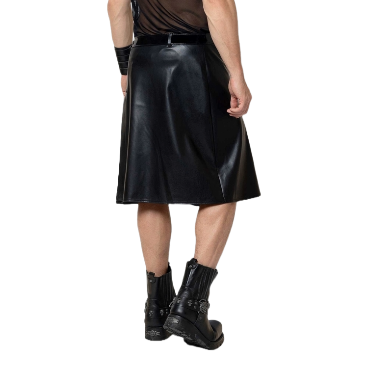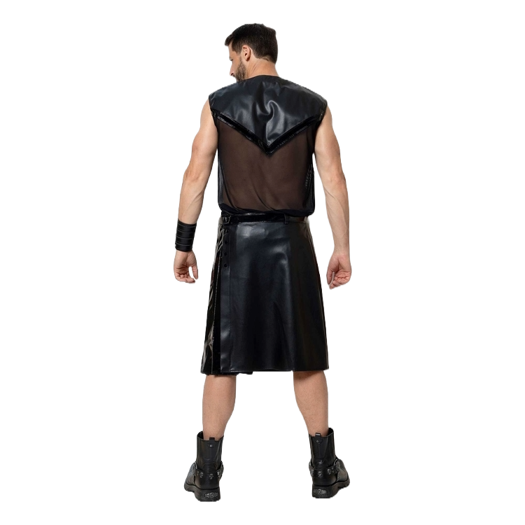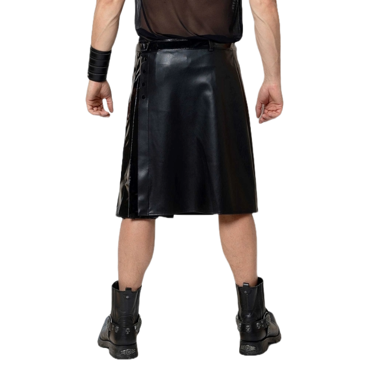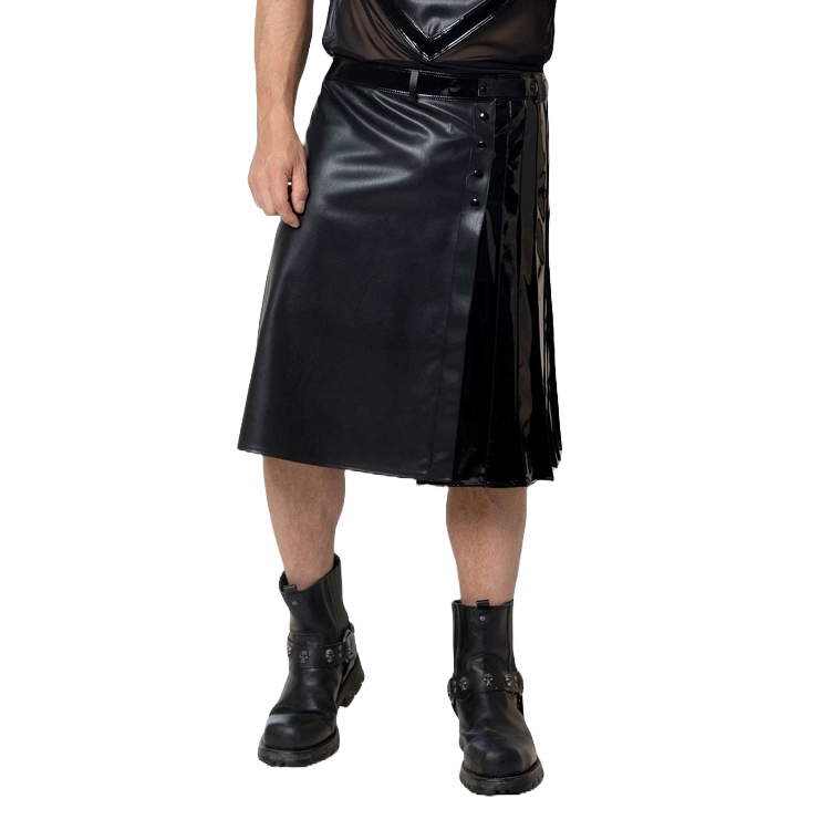 Deze stoere Ingvald schotse kilt van Patrice Catanzaro is gemaakt van zwart kunstleer met een inzetstuk in glanzend lak. Deze rok heeft ook riemlussen.