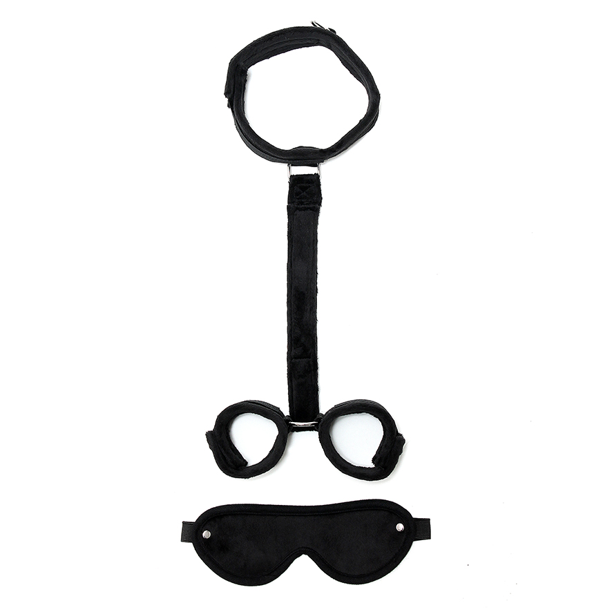 Soft bondage klittenband set, oogmasker met halsband waaraan een verstelbare band bevestigd is waar de handboeien aan verbonden zijn.