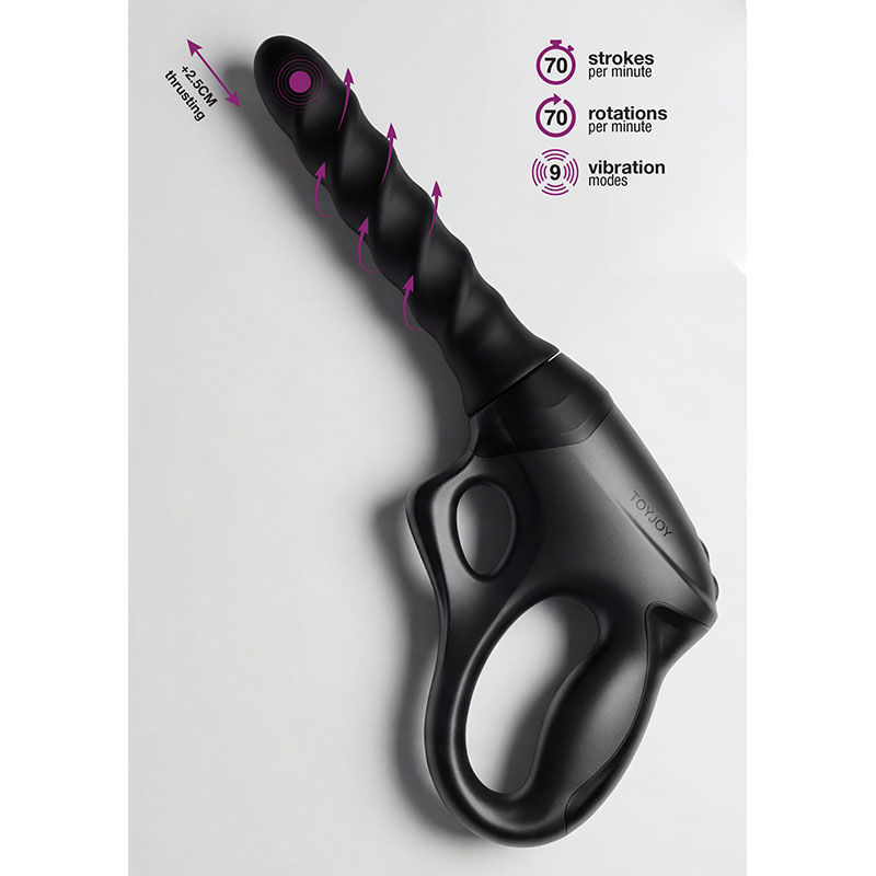De ergonomische pistoolgreep zorgt voor stevige, moeiteloze controle, terwijl de gepatenteerde 360° roterende, stotende en vibrerende shaft een unieke interne sensatie creëert. Met een krachtige thrusting beweging tot 2,5 cm, 70 stoten per minuut en 70 rotaties per minuut bouwt de intensiteit zich seconde na seconde op. Kies uit 9 vibratiestanden, 6 rotatiestanden en 6 thrusting modi om de ervaring perfect af te stemmen op jouw stemming en verlangen.