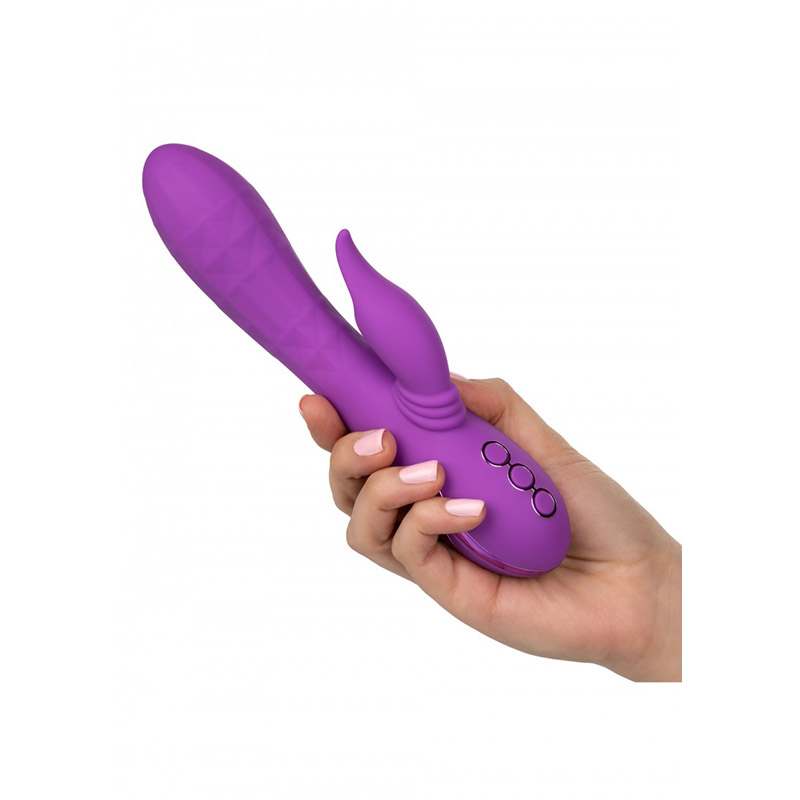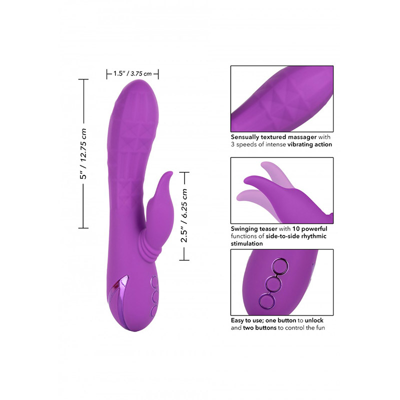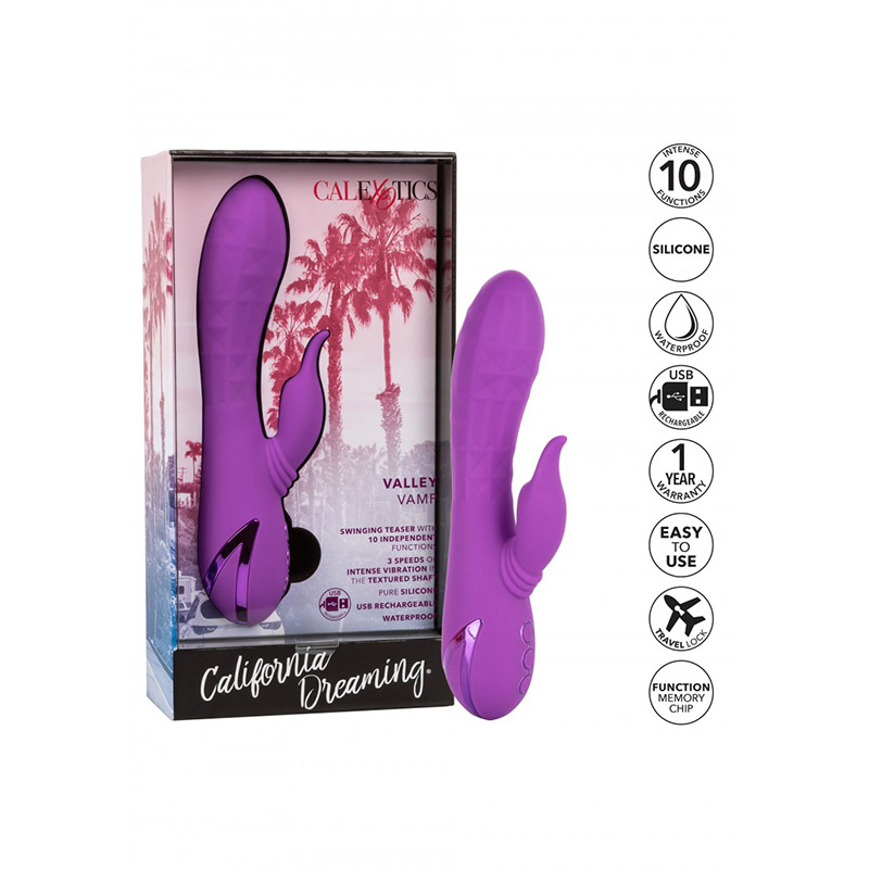 De Valley Vamp is een krachtige stimulator met 3 snelheden van een sensueel gestructureerde rabbit vibrator. Hij heeft 10 functies van vibratie, pulsatie en een van links naar rechts bewegende kop. Gemaakt van Lichaamsveilig Silicone. De State-of-the-art geheugenchip hervat zijn laatst gebruikte functie. Gemakkelijke drukknopbediening met veiligheidsvergrendeling. USB oplaadbaar – inclusief oplaadsnoer. Volledige opgeladen binnen 2,5 uur. Werkt ongeveer 35 minuten op hoge snelheid en ongeveer 2 uur op de minimale snelheid.